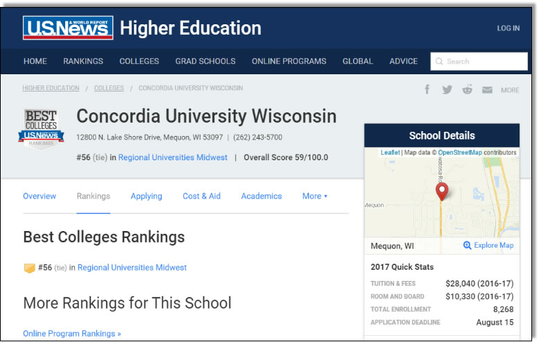 美國新聞與世界報道USnews公布了2017年美國本科院校的排名,本科院校排名分為綜合性大型和文理學院,按地理位置又分為地區性大學和地區性文理學院。下面是2017年USnews美國中西部地區大學排名,此次排名內容涉及到了學費、學生數以及錄取率等眾多因素。其中在中西部聯盟-橫跨美國12個州的1431所學校中,美國威斯康星協和大學排Top56名,(US News-America' Best College 2015, University-Master's (Midwest 第一級)。校譽遠超過多所州立公立大學(選官方公布網站)